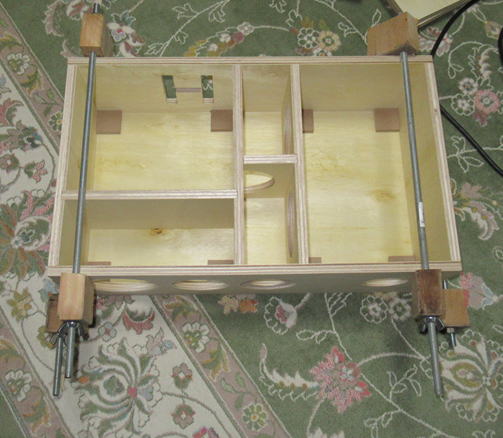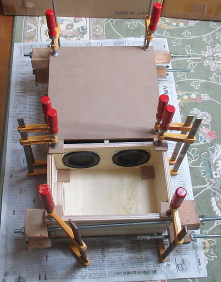 まずは1台目の接着です。クランプがもっとたくさんあれば2台同時に作業できるのですが・・・