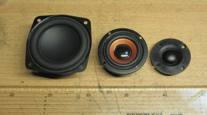 購入したスピーカたちです。左から3インチ低音用(@1300円)、2インチMID用(@400円)、ツイータ(@400円)です。