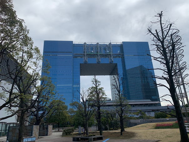 新橋からゆりかもめに揺られて20分。変わった形のビルです。電波塔でもあるようです。