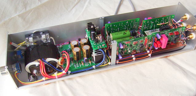 回路はMJの製作記事を参考にさせていただきました。アンプ1とアンプ2の間にRIAA素子を挟むCR型でRIAA素子はアンプ1のエミフォロを省略しそこに組み込みました。ACコードは銅パイプの中を這わしています。電源基板はNONFBタイプ。その上にミューティング基板を乗せました。誘導ハムなどを考えレイアウトはかなり苦心したつもりです。