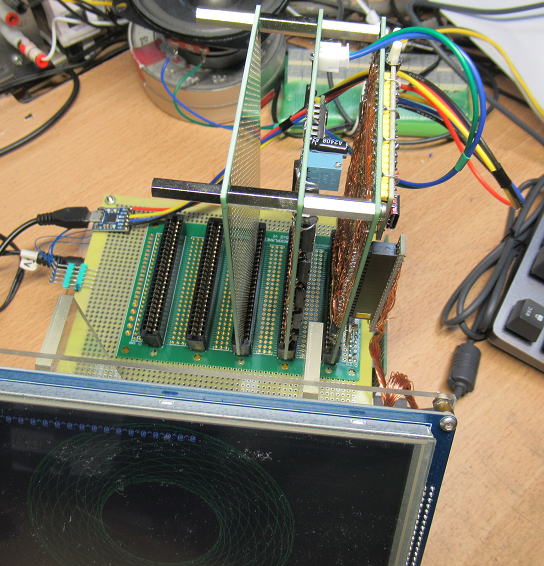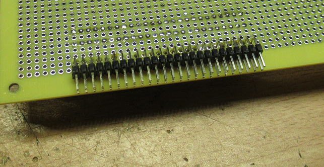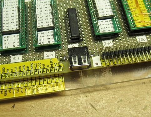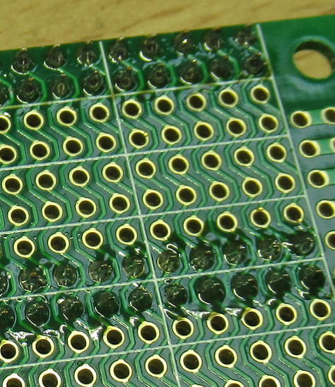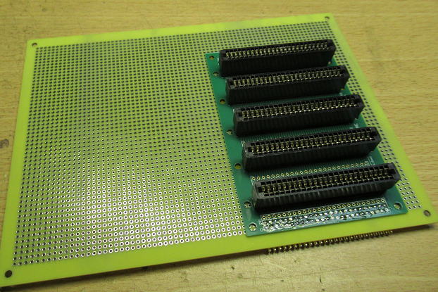 前につくった、バックプレーンを使います。ユニバーサル基板の裏側に配置したので、