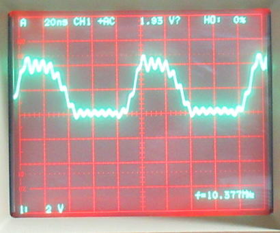 | 166MHz 約2.6倍のオーバクロックです。 動きはしましたが、波形がなかり汚くなりました。 内部でクロックが漏れ出ているような感じです。 |