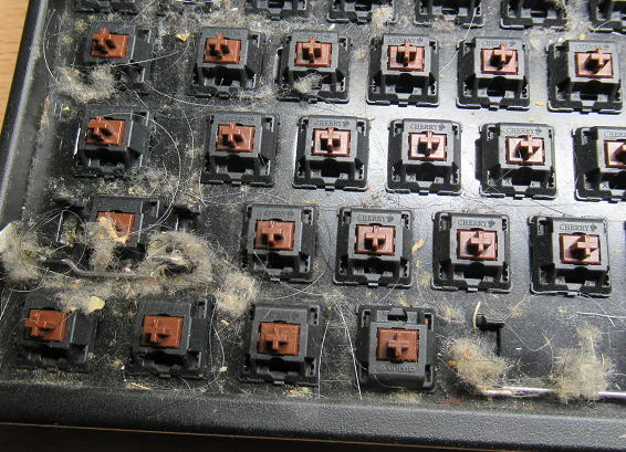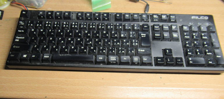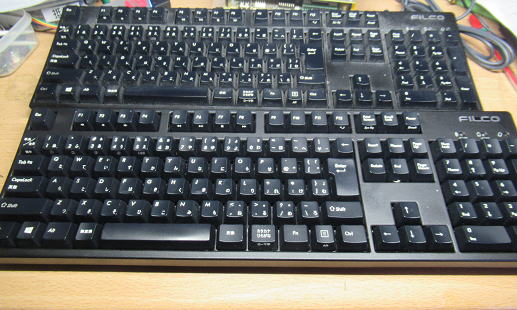 埃まみれでした。同じキーボードが2個あるので、キーキャップの戻しは並べて行います。