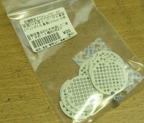 丸形のユニバーサル基板。ペットボトルの蓋などにはまります。
