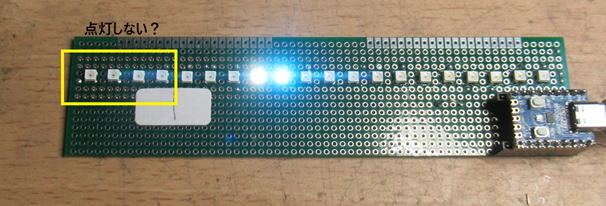 20個あるうちの後方の4個のLEDが点灯しません。それにすこし色調がおかしいLEDもあります。