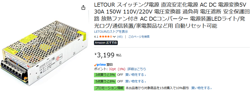5V30Aのスイッチング電源が届きました。