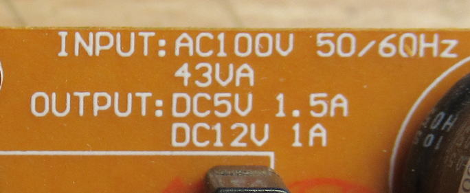 基板をみると、一つだけ記載がありました。DC5Vが1.5A、DC12Vが1Aのようです。