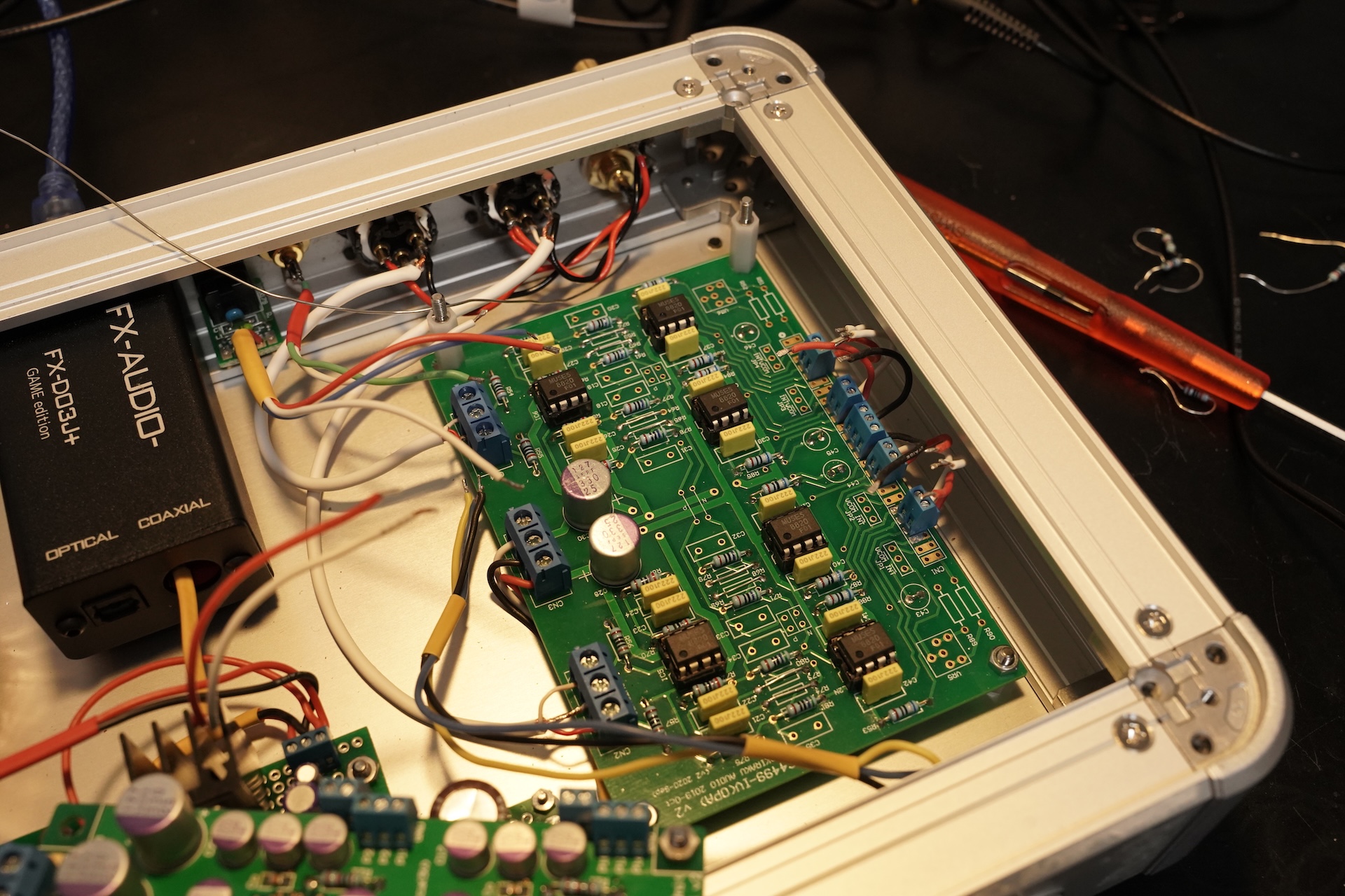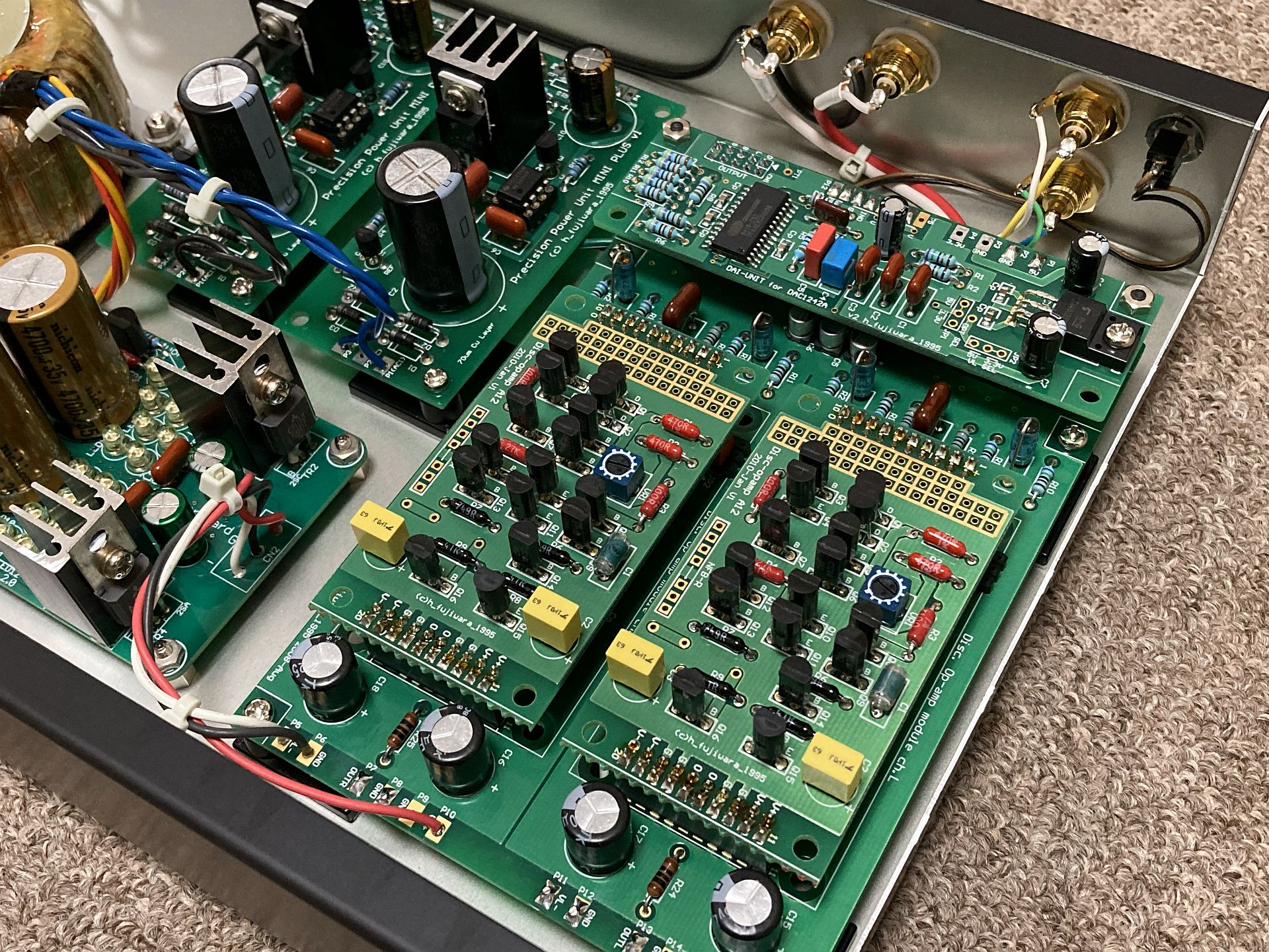 その他、抵抗、コンデンサ類は手持ちのストックからオーディオ用、一般用とごちゃまぜに実装してます。