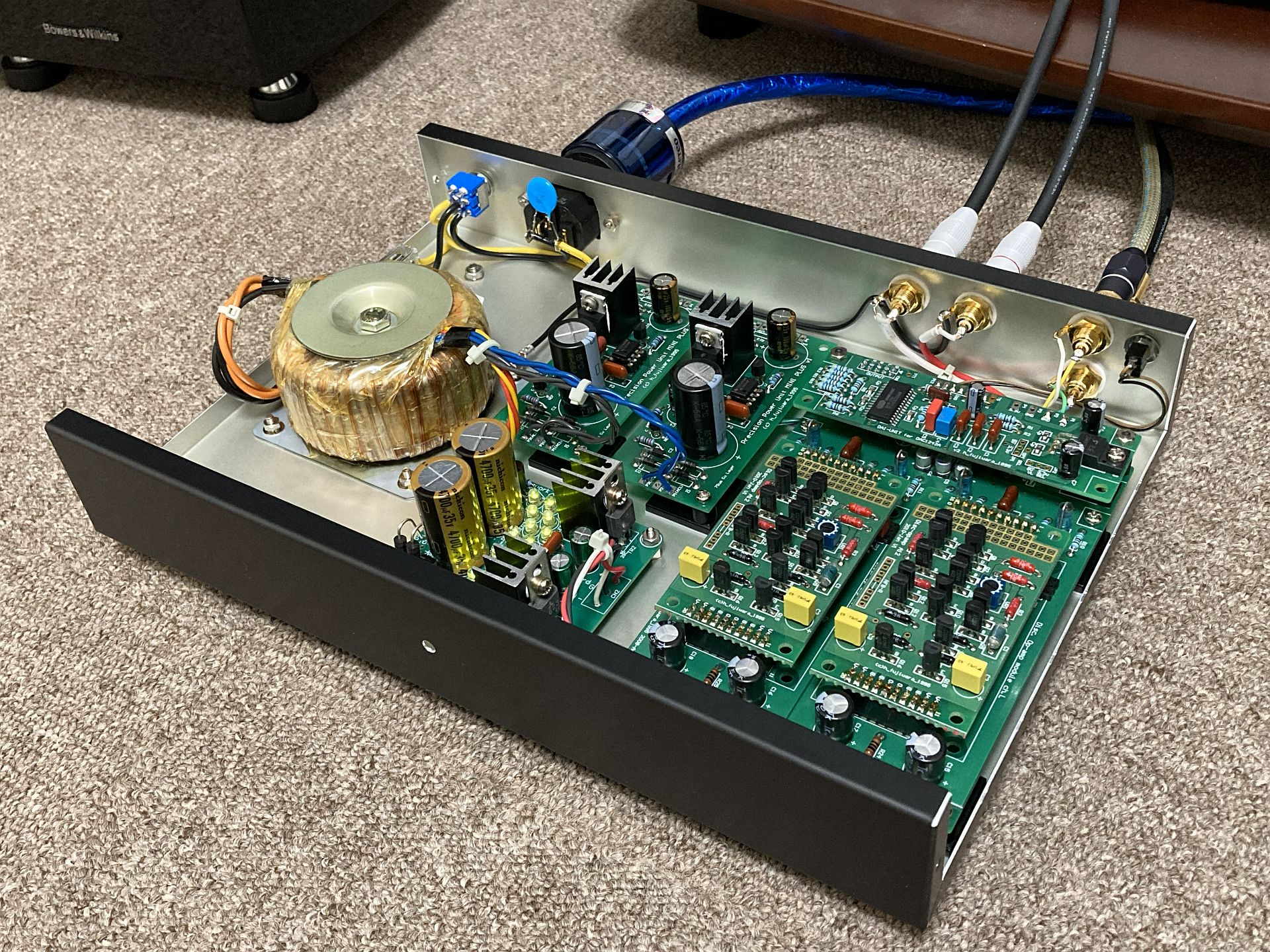 独身時代の18年前はとにかく物量投入型の大げさなシステムを組んでいましたが、今は贅沢なオーディオルームも無いので(家族に顰蹙を買わないように)シンプル&コンパクトにまとめる事を心がけて作りました。ただ、期待通りの素晴らしい音を奏でており大満足しております。あとは、半田付けの際に老眼鏡が必須になった所に18年という月日の流れをひしひしと感じました(笑)。